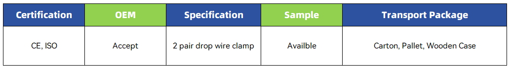 The plastic drop cable clamp is made of stainless steel rope and flame-retardant ABS plastic body, with a round steel wire at one end. It is suspended on the support of the utility pole and the optical cable is suspended on the support device.