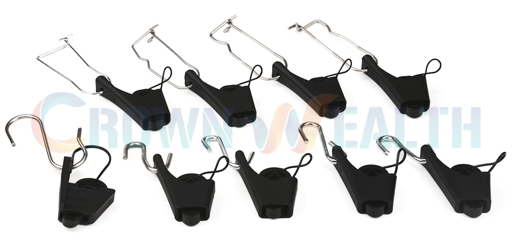 Plastic drop wire clamps are used for fiber optic cable in FTTX and for telephone drop wire cable, both for round type and flat type. The variety of hook combinations makes the clamp more widely applicable to various installation occasions.